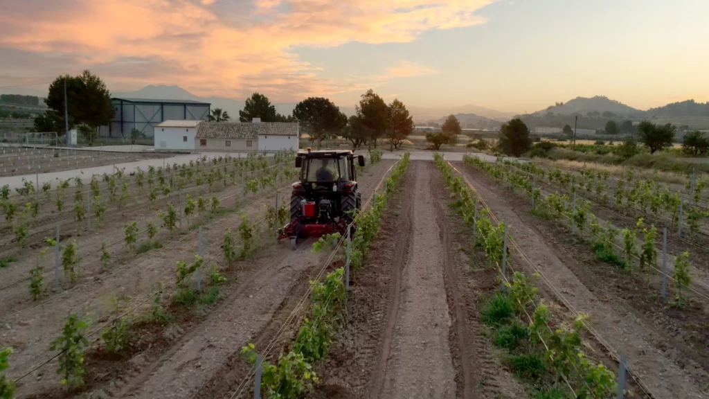 The farm, located in Yecla, consists of 1.3 hectares of super-intensive olive grove and 1.3 hectares of Syrah variety vineyard grafted onto vigorous rootstock, which makes it possible to demonstrate that the total mechanization of agricultural tasks is possible. Furthermore, it includes a traditional olive grove more than 150 years old in a 12×12 pattern, showing how mechanization can be applied even to historic crops.