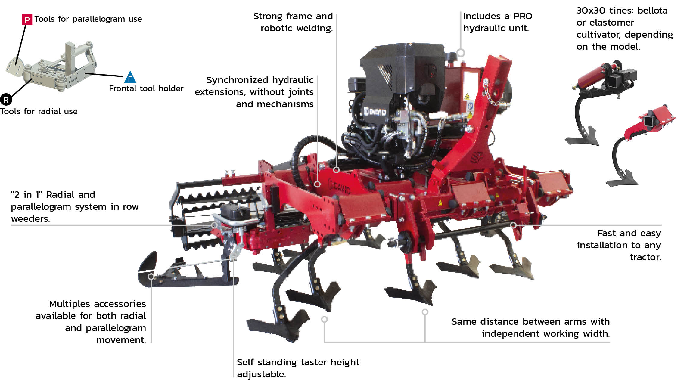 - Hydraulic width adj. direct to tractor (not available in fixed models).