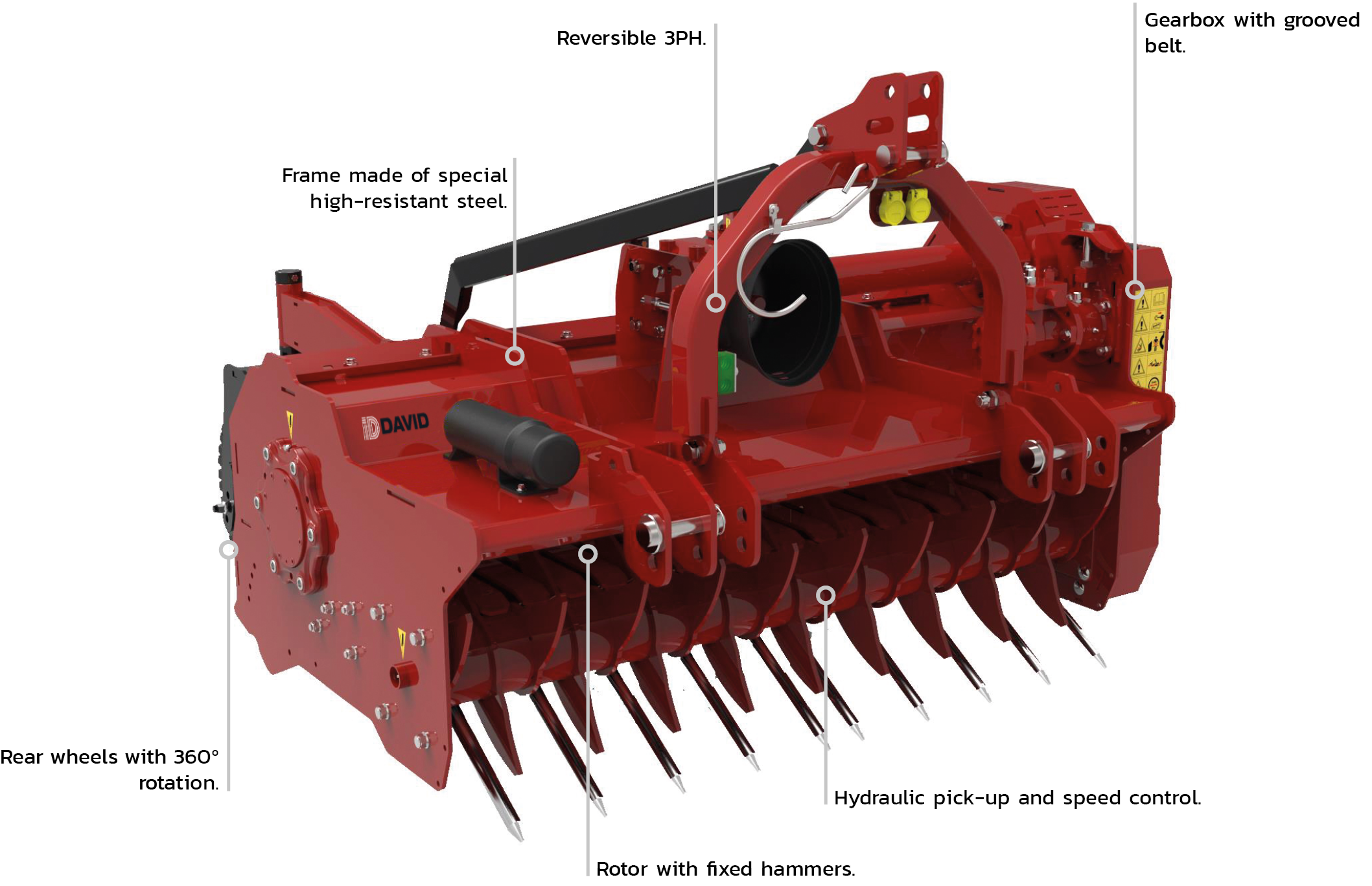 Mower with hydraulic pick-up destined to mulch pruning remains up to 10 cm. Its patended rotors triples the working speed with respect to the conventional ones with rear grid.