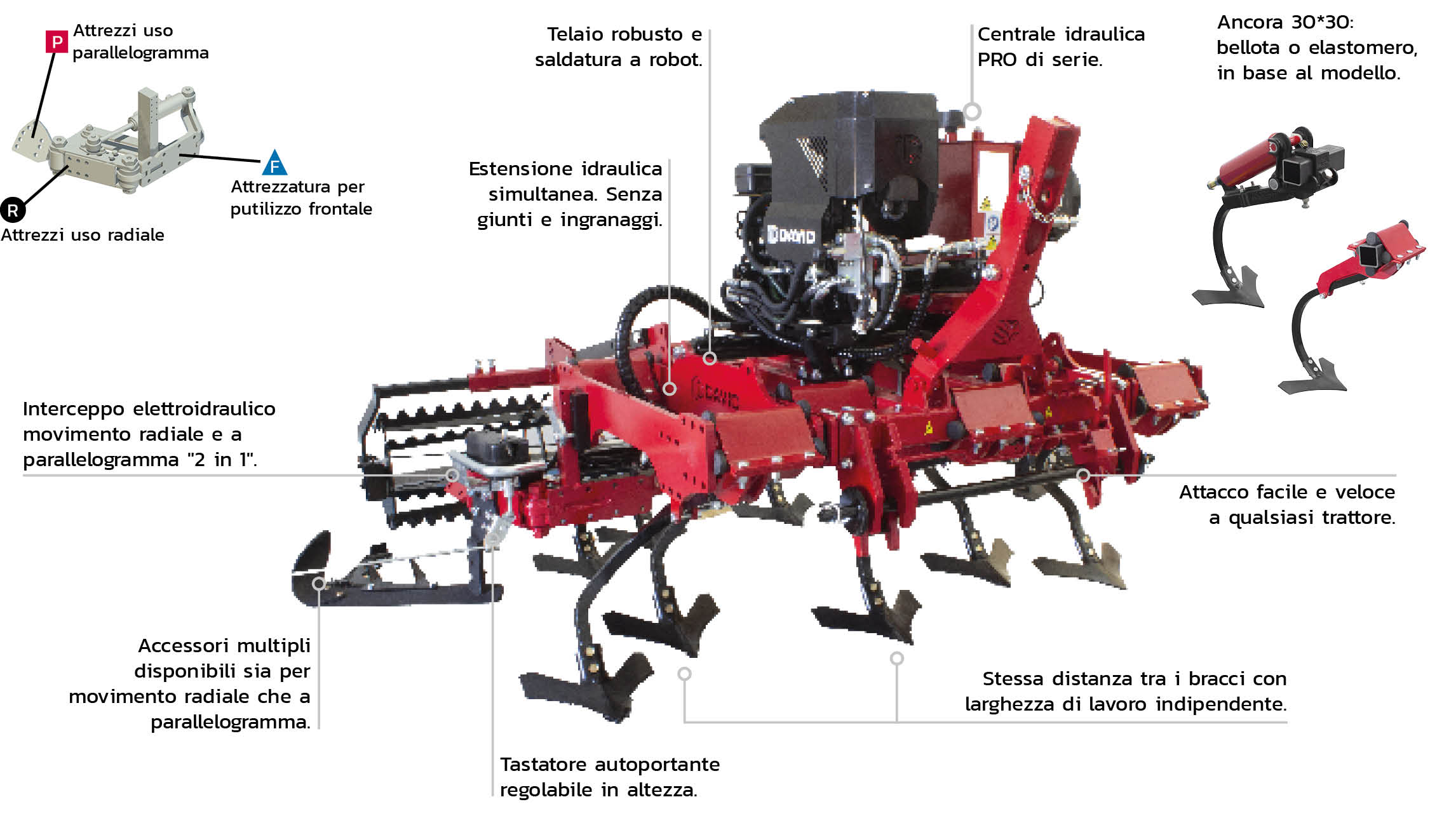 - Estensione idraulica diretta al trattore (non disponibile sui modelli fissi).