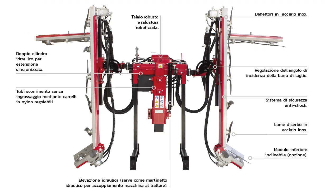 Cimatrice per viti e colture a siepe ideale per tenere sotto controllo la crescita vegetativa. Velocità di lavoro elevate, taglio pulito, manutenzione ridotta e ottima visuale dalla cabina. Disponibili 4 barre falcianti e 6 funzioni elettroidrauliche.