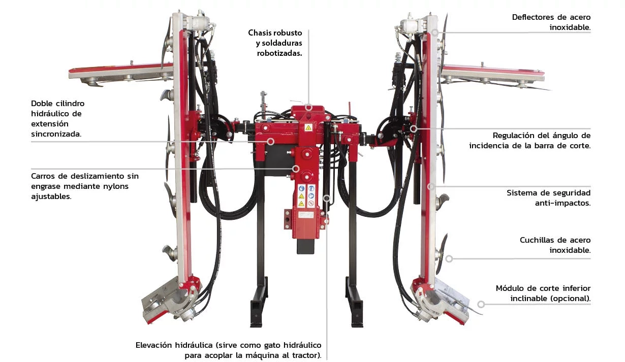 Despuntadora de viña y cultivos en seto. Ideadas para mantener controlado el crecimiento vegetativo. Altas velocidades de trabajo, corte limpio, bajo mantenimiento y visión excelente desde el punto de cabina. Disponible 4 barras de corte y 6 movimientos electrohidráulicos.